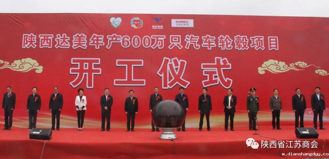江苏省盐城市委书记戴源、陕西省铜川市委书记杨长亚等党政领导与相关企业家代表出席了开工仪式。铜川市委常委、常务副市长严维佳致辞,表示盐铜两市的合作,一定能为两地企业的发展增加新的优势、增强新的活力。江苏悦达集团党委书记、董事局主席王连春介绍了项目相关情况,随后出席仪式的领导嘉宾共同开启项目开工仪式启动球,宣告陕西达美汽车轮毂项目正式开工。必威安卓常务副会长、西安宝马建设科技股份有限公司董事长戴贵,必威安卓副会长、陕西西铜高速公路有限公司董事长王兵,商会副秘书长刘飞参加了开工仪式。